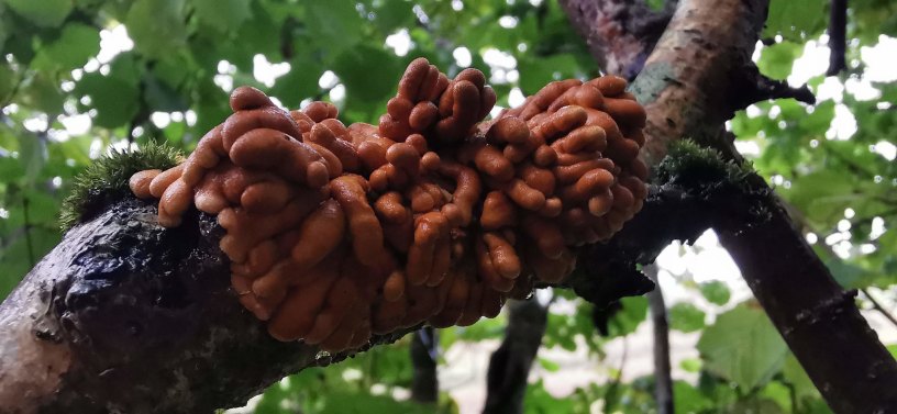 Hazel gloves fungus (Hypocreopsis rhododendri): a conservation priority species that exclusively grows on old hazel trees and looks rather like intestines! It’s a sure sign of clean air and a wood’s ancient origins.