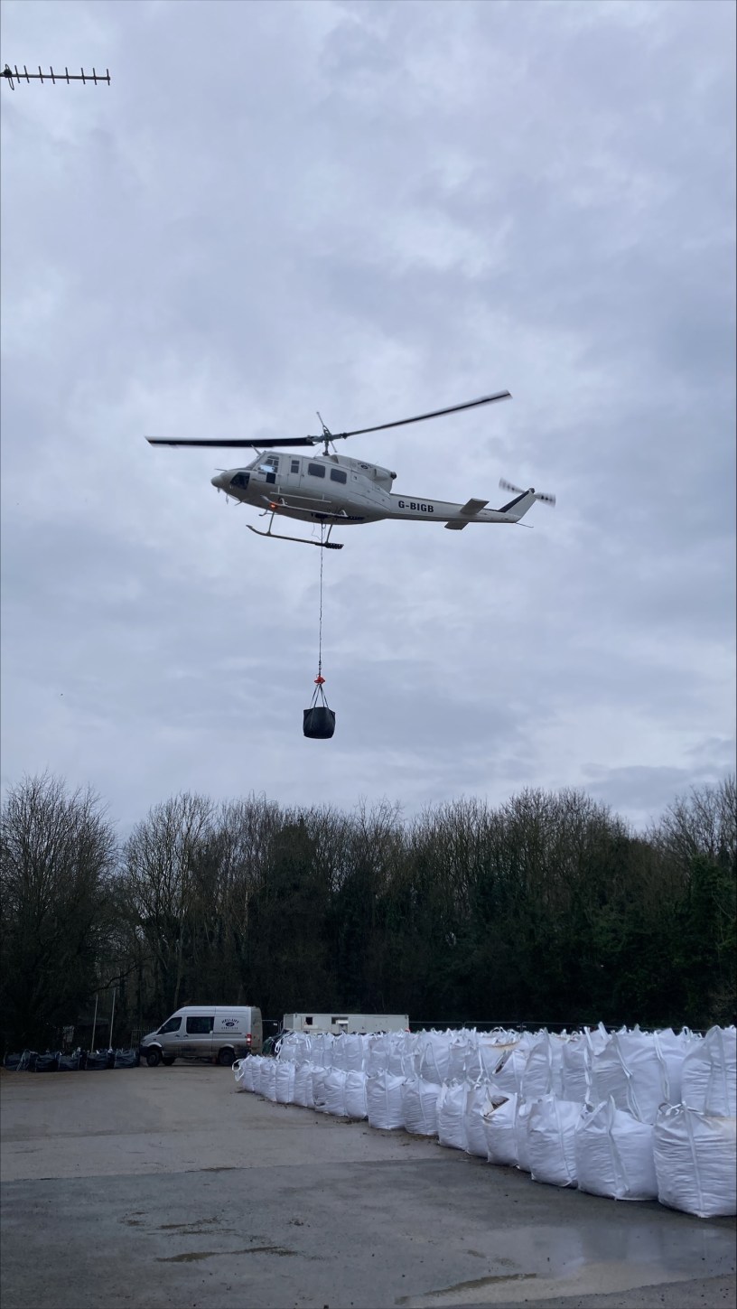 A helicopter is being used over the next couple of weeks to place around 1000 tonne bags of rock into five key locations in the flood embankments where there are currently gaps, to form temporary protection.