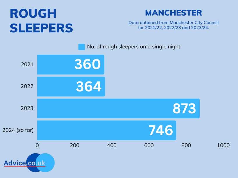 Figures obtained by Advice.co.uk found that Manchester City Council has logged 2,343 counts of rough sleeping in the area since 2021.