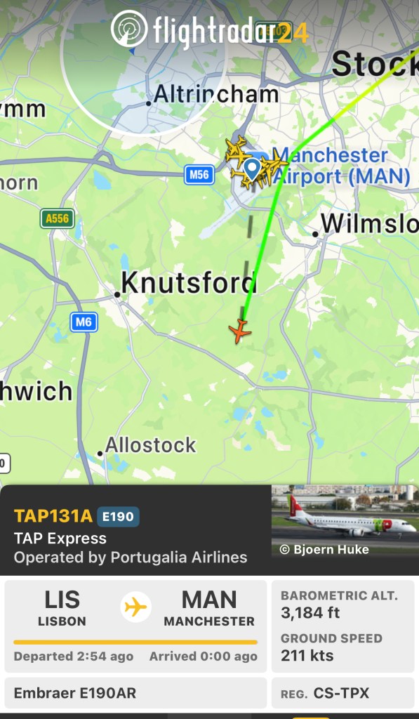 The aircraft is still on the ground in Manchester about 7 hours after landing.