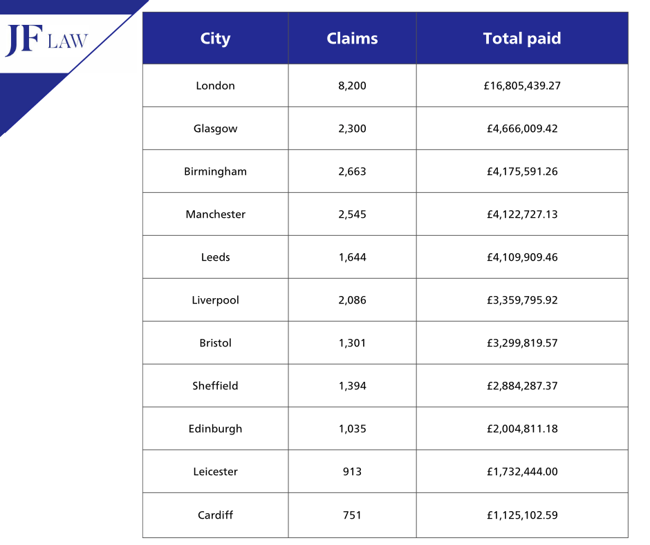 Overall, applicants from the 11 cities surveyed (The three British capitals plus Glasgow and seven major English cities) made 24,832 claims and received £48,285,937.17 in compensation.