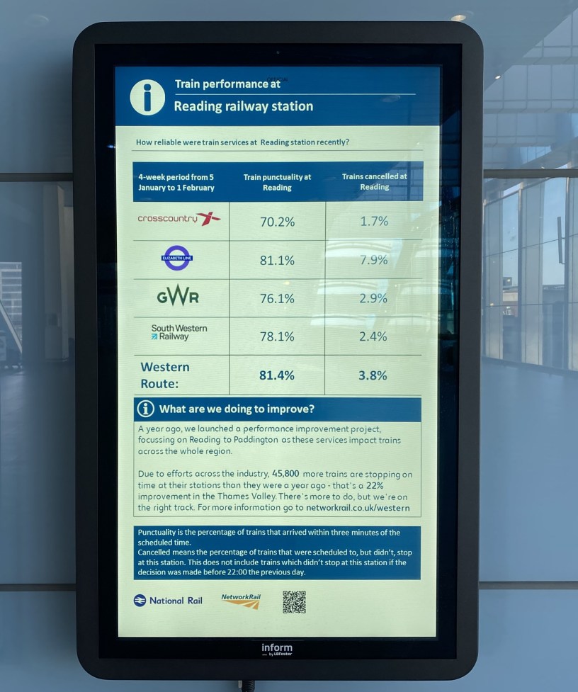 The screens also display a short commentary on work underway by the operators and Network Rail to improve performance, informing and assuring passengers of the ongoing work across their area to improve the reliability and efficiency of services.