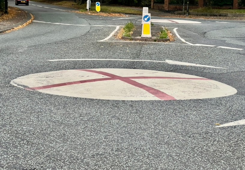 The problem is these roundabouts need to be white for driver visibility; sadly, the council is either going to try and remove the red crosses or repaint the circles.