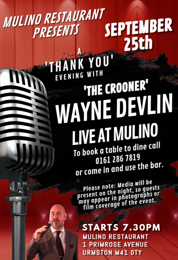 Mulino Restaurant is proud to present a special evening of live music on 25 September, as much-loved local entertainer Wayne Devlin, affectionately known as “The Crooner,” takes to the stage for a heartfelt ‘Thank You’ Evening.