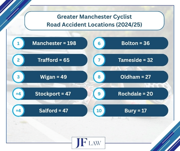 JF Law also analysed where cyclist casualties most frequently occurred within Greater Manchester over the past three years. Manchester recorded the highest number of incidents with 198 cases, followed by Trafford with 65.