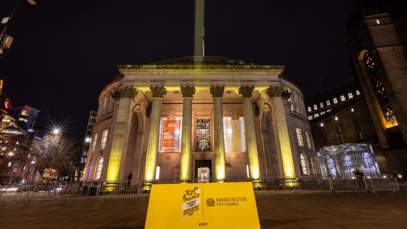 The starts and finishes for the historic women’s race visit to Britain were revealed alongside the men’s route, which starts in Edinburgh on Friday, 2 July 2027. This ‘Tour de Skies’ moment saw ten towns illuminated with yellow beams, including Manchester, where the Central Library provided a stunning backdrop.